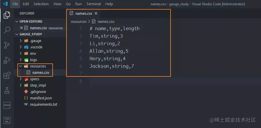 在gauge_study项目下新建一个resources目录,用来存放csv文件, 可以定义一个names.csv文件,存放我们的测试数据