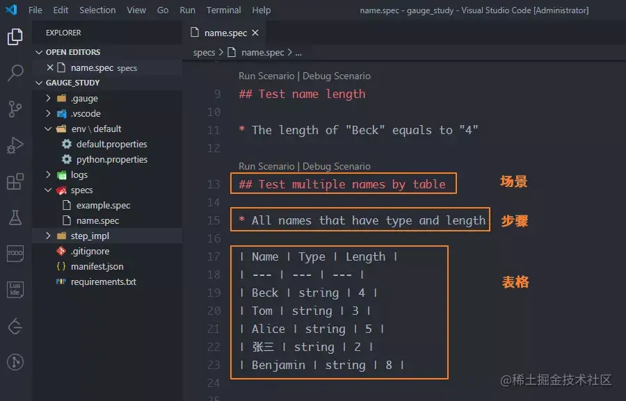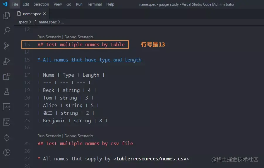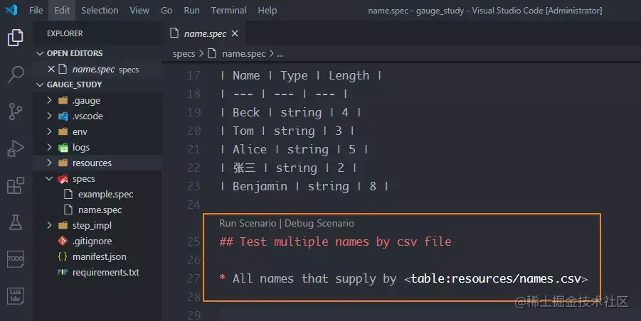 接着在描述文件name.spec中添加描述,和表格一样要设置场景和步骤, 然后需要在步骤描述里加一个csv文件地址的引用table:resources/names.csv