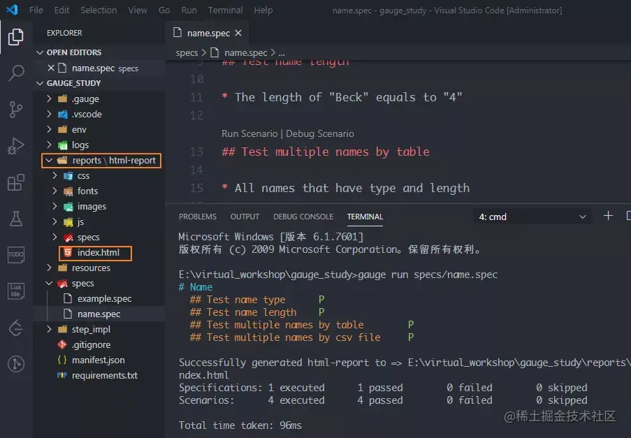 运行之后,会自动生成一个reports目录,index.html就是最终的测试报告,其相对路径是:reports/html-report/index.html