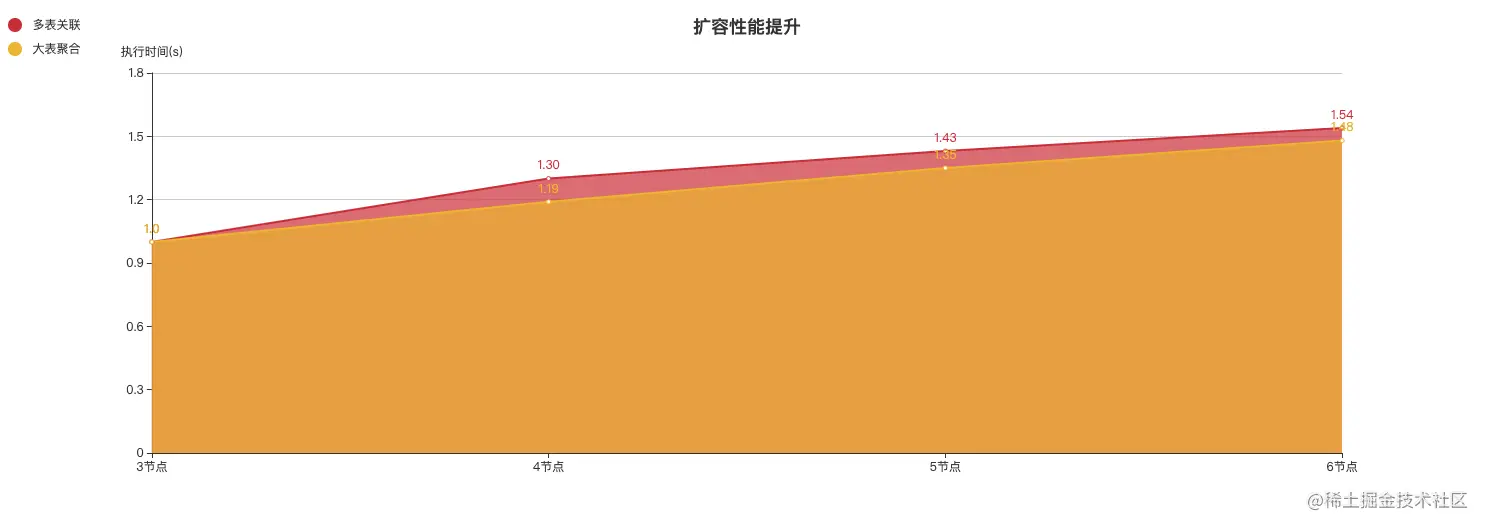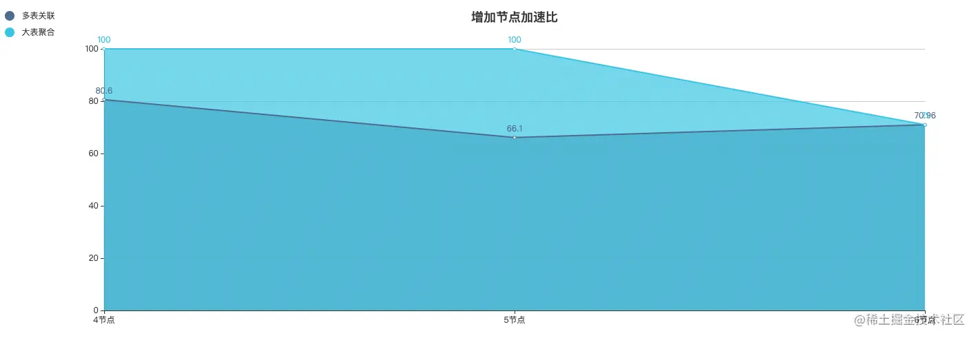 - 增加节点加速比:这个指标是当前节点数所执行全量SQL,对比当前节点数减一统计的,例如在4节点时,所执行的62个多表关联SQL速度有80.6%的比例比3节点更快。