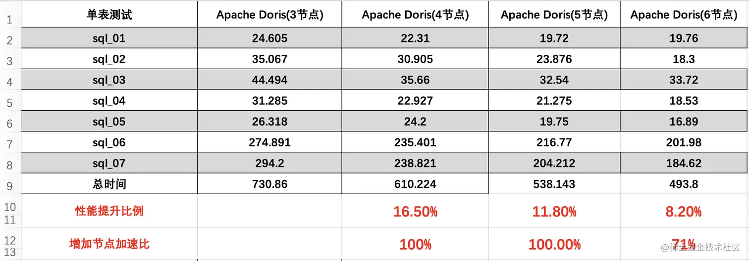 上边的图我们可以清晰的看到,当集群处于3个节点,在扩容到4节点时,性能提升最明显,然后继续加节点时,性能递增的趋势逐渐平缓。这个增长走势是符合正常分布式集群扩容的性能增长趋势的,我们每扩容一个节点,新增节点(算力)在集群中的占比就会降低一些,此时若是性能提升仍然没有达到我们的预期时,应该考虑优化SQL(Bitmap索引、物化视图、ROLLUP、分区分桶)等等手段来实现,而一味堆机器则边际效益递减。