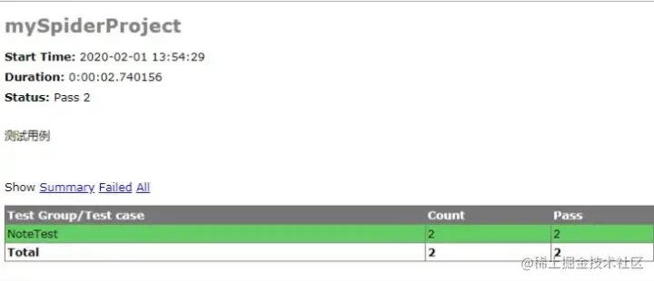 runner = HtmlTestRunner.HTMLTestRunner(stream=fp, title='mySpiderProject', description='测试用例')