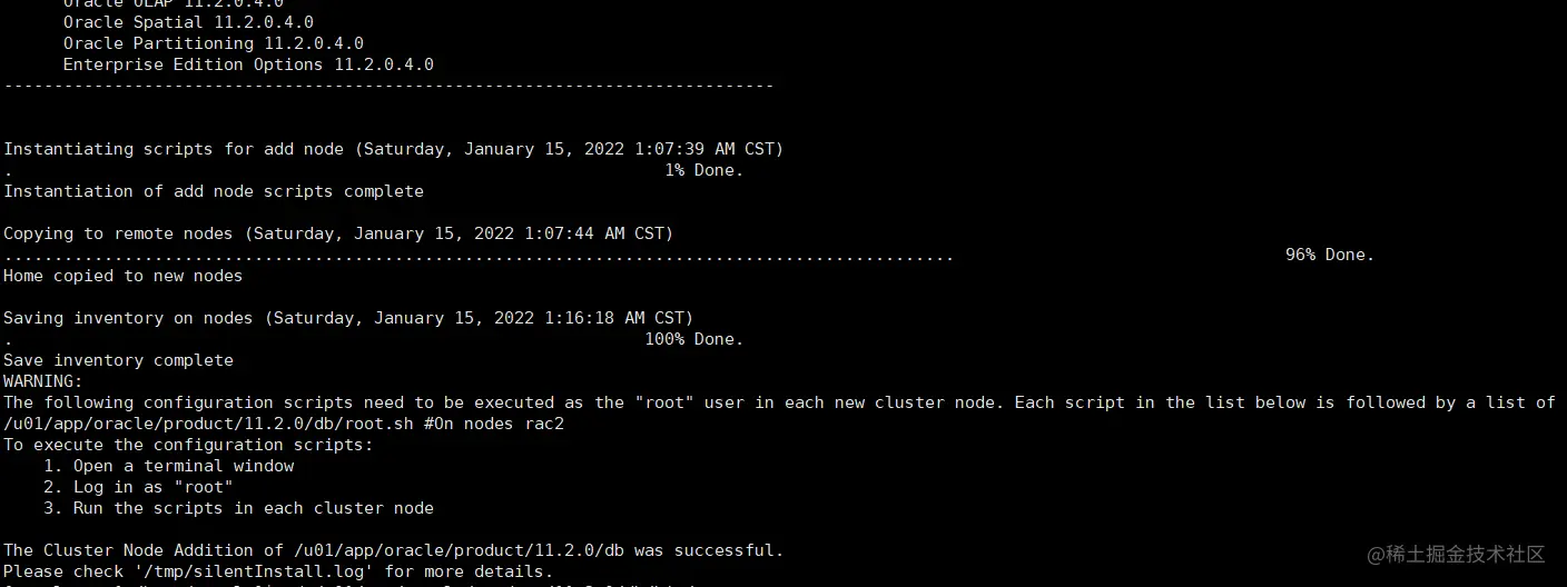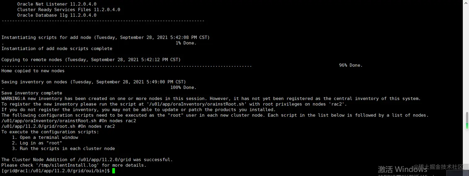 [grid@rac1:/u01/app/11.2.0/grid/oui/bin]$ ./addNode.sh -silent "CLUSTER_NEW_NODES={rac2}" "CLUSTER_NEW_VIRTUAL_HOSTNAMES={rac2-vip}"