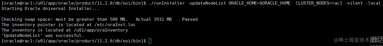 [oracle@rac1:/u01/app/oracle/product/11.2.0/db/oui/bin]$ ./runInstaller -updateNodeList ORACLE_HOME=$ORACLE_HOME CLUSTER_NODES=rac1 -silent -local