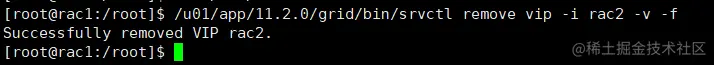 [root@rac1:/root]$ /u01/app/11.2.0/grid/bin/srvctl remove vip -i rac2 -v -f