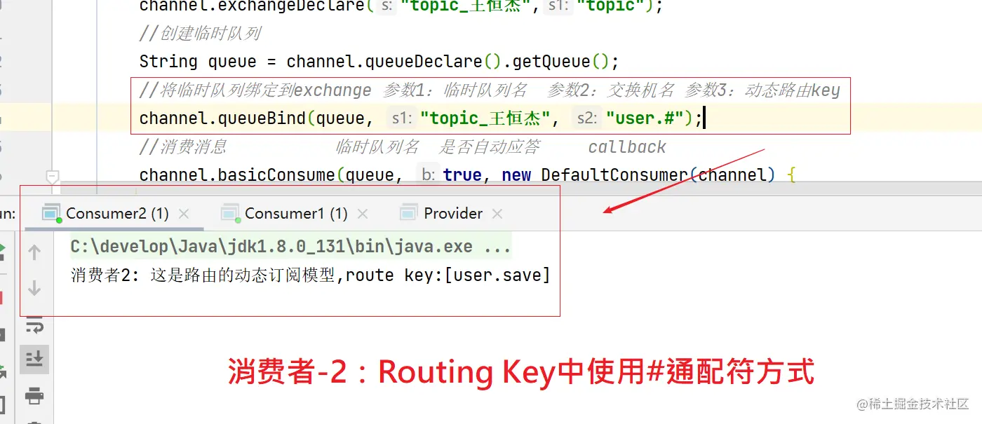 public class Consumer2 { public static void main(String[] args) throws IOException { //获取链接 Connection connection = RabbitMQUtil.getConnection(); //创建通道 final Channel channel = connection.createChannel(); //设置交换机参数 参数1:交换机名称 参数2:交换机类型 topic 使用动态路由(通配符方式) channel.exchangeDeclare("topic_王恒杰","topic"); //创建临时队列 String queue = channel.queueDeclare().getQueue(); //将临时队列绑定到exchange 参数1:临时队列名 参数2:交换机名 参数3:动态路由key channel.queueBind(queue, "topic_王恒杰", "user.#"); //消费消息 临时队列名 是否自动应答 callback channel.basicConsume(queue, true, new DefaultConsumer(channel) { @Override public void handleDelivery(String consumerTag, Envelope envelope, AMQP.BasicProperties properties, byte[] body) throws IOException { System.out.println("消费者2: " + new String(body)); } }); }}