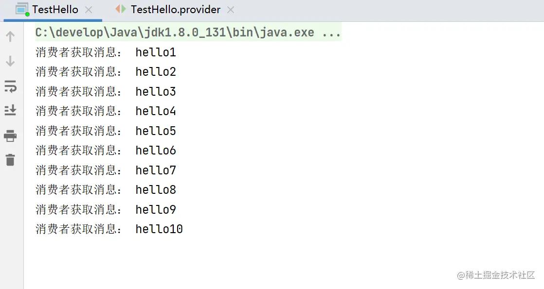 /** * @author 王恒杰 * @date 2022/1/21 14:24 * @Description: */@RunWith(SpringRunner.class)//指定测试类启动时入口类的位置 //等价于指定工厂的位置@SpringBootTest(classes = RabbitMQApplication.class)public class TestHello { // 生产者 // 生产者 @Test public void provider() throws IOException, TimeoutException { //创建连接工厂 ConnectionFactory factory = new ConnectionFactory(); //设置rabbitmq服务器IP地址 factory.setHost("192.168.5.128"); //设置rabbitmq服务器连接端口 factory.setPort(5672); //设置rabbitmq服务器虚拟主机 factory.setVirtualHost("yingxue"); //设置rabbitmq服务器用户名 factory.setUsername("whj"); //设置rabbitmq服务器密码 factory.setPassword("563135"); //获取连接 Connection connection = factory.newConnection(); System.out.println(connection); //获取通道 Channel channel = connection.createChannel(); System.out.println(channel); /**设置队列参数 * @param queue 队列名称 如果这个队列不存在,将会被创建 * @param durable 持久性:用来定义队列是否要持久化 true:持久化 false:不持久化 * @param exclusive 是否只能由创建者使用,其他连接不能使用。 true:独占队列 false:不独占队列 * @param autoDelete 是否自动删除(没有连接自动删除) true:自动删除 false:不自动删除 * @param arguments 队列的其他属性(构造参数) */ HashMap<String, Object> map = new HashMap<>(); map.put("x-max-length",5); //设置队列最大长度 //可以通过为x-overflow队列声明参数提供字符串值来设置溢出行为 。 //可能的值为drop-head(默认)或 reject-publish //map.put("x-overflow","reject-publish"); //4、设置队列 channel.queueDeclare("helloQueues",true,false,true,map); /**发布消息 * @param exchange 消息交换机名称,空字符串将使用直接交换器模式,发送到默认的Exchange=amq.direct。此状态下,RoutingKey默认和Queue名称相同 * @param queueName 队列名称 * @param BasicProperties 设置消息持久化:MessageProperties.PERSISTENT_TEXT_PLAIN是持久化;MessageProperties.TEXT_PLAIN是非持久化。 * @param body 消息对象转换的byte[] */ for (int i = 1; i < 11; i++) { String s = "hello"+i; //5、发布 生产消息 channel.basicPublish("","helloQueues",MessageProperties.PERSISTENT_TEXT_PLAIN,s.getBytes()); } //关闭连接 channel.close(); connection.close(); } // 消费者 public static void main(String[] args) throws Exception { //创建连接工厂 ConnectionFactory factory = new ConnectionFactory(); //设置rabbitmq服务器IP地址 factory.setHost("192.168.5.128"); //设置rabbitmq服务器连接端口 factory.setPort(5672); //设置rabbitmq服务器虚拟主机 factory.setVirtualHost("yingxue"); //设置rabbitmq服务器用户名 factory.setUsername("whj"); //设置rabbitmq服务器密码 factory.setPassword("563135"); //获取连接 Connection connection = factory.newConnection(); //获取通道 Channel channel = connection.createChannel(); /**设置队列参数 * @param queue 队列名称 如果这个队列不存在,将会被创建 * @param durable 持久性:用来定义队列是否要持久化 true:持久化 false:不持久化 * @param exclusive 是否只能由创建者使用,其他连接不能使用。 true:独占队列 false:不独占队列 * @param autoDelete 是否自动删除(没有连接自动删除) true:自动删除 false:不自动删除 * @param arguments 队列的其他属性(构造参数) */ HashMap<String, Object> map = new HashMap<>(); map.put("x-max-length",5); //设置队列最大长度 //可以通过为x-overflow队列声明参数提供字符串值来设置溢出行为 。 //可能的值为drop-head(默认)或 reject-publish //map.put("x-overflow","reject-publish"); /**设置队列参数 * @param queue 队列名称 如果这个队列不存在,将会被创建 * @param durable 持久性:用来定义队列是否要持久化 true:持久化 false:不持久化 * @param exclusive 是否只能由创建者使用,其他连接不能使用。 true:独占队列 false:不独占队列 * @param autoDelete 是否自动删除(没有连接自动删除) true:自动删除 false:不自动删除 * @param arguments 队列的其他属性(构造参数) */ channel.queueDeclare("helloQueues", true, false, true, map); /**消费者消费消息 * @param queue 队列名称 * @param autoAck 是否自动应答。false表示consumer在成功消费过后必须要手动回复一下服务器,如果不回复,服务器就将认为此条消息消费失败,继续分发给其他consumer。 * @param callback 回调方法类,一般为自己的Consumer类 */ channel.basicConsume("helloQueues", true, new DefaultConsumer(channel) { @Override public void handleDelivery(String consumerTag, Envelope envelope, AMQP.BasicProperties properties, byte[] body) throws IOException { java.lang.String message = new String(body); System.out.println("消费者获取消息: " + message); } }); }}
