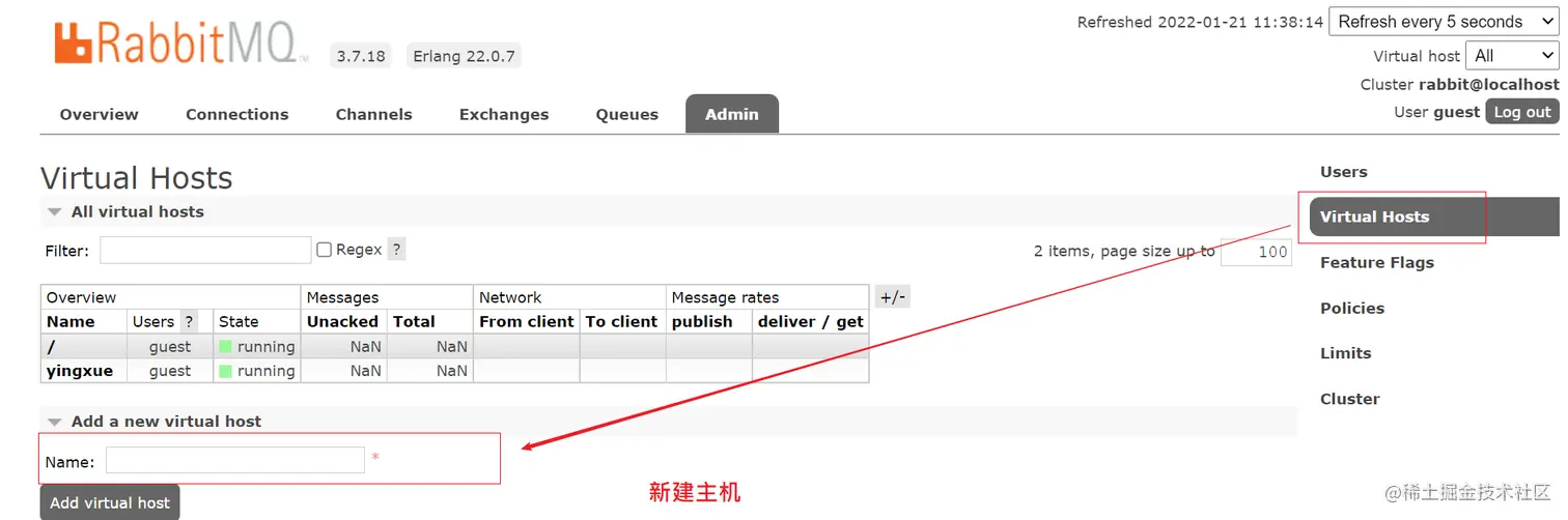 虚拟主机:为了让各个用户可以互不干扰的工作,RabbitMQ添加了虚拟主机(Virtual Hosts)的概念。其实就是一个独立的访问路径,不同用户使用不同路径,各自有自己的队列、交换机,互相不会影响。