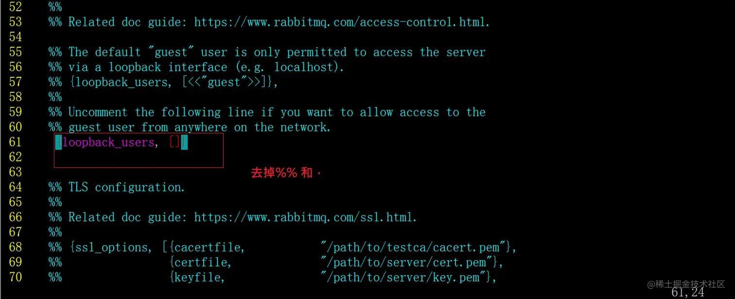 # 5.查看配置文件位置 ls /etc/rabbitmq/rabbitmq.config# 6.修改配置文件(参见下图:) :61 查看61行 vim /etc/rabbitmq/rabbitmq.config