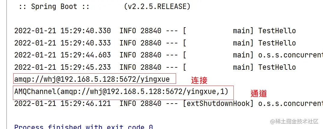 public class TestHello { // 生产者 @Test public void provider() throws IOException, TimeoutException { //创建连接工厂 ConnectionFactory factory = new ConnectionFactory(); //设置rabbitmq服务器IP地址 factory.setHost("192.168.5.128"); //设置rabbitmq服务器连接端口 factory.setPort(5672); //设置rabbitmq服务器虚拟主机 factory.setVirtualHost("yingxue"); //设置rabbitmq服务器用户名 factory.setUsername("whj"); //设置rabbitmq服务器密码 factory.setPassword("563135"); //获取连接 Connection connection = factory.newConnection(); System.out.println(connection); //获取通道 Channel channel = connection.createChannel(); System.out.println(channel); channel.close(); connection.close(); }