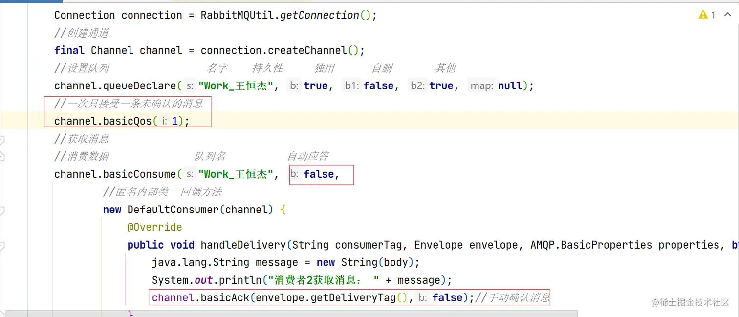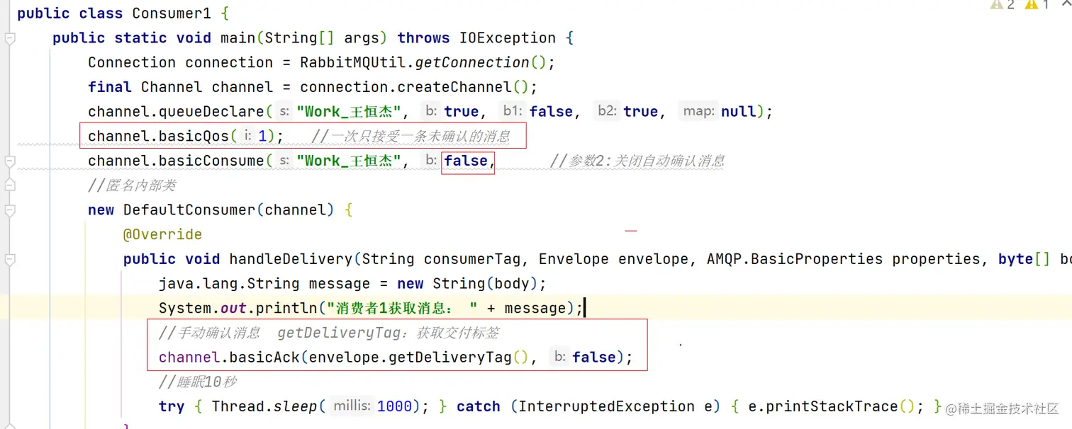 /** * @author 王恒杰 * @date 2022/1/22 19:47 * @Description: */public class Consumer1 { public static void main(String[] args) throws IOException { //获取链接 Connection connection = RabbitMQUtil.getConnection(); //创建通道 Channel channel = connection.createChannel(); //设置队列 channel.queueDeclare("Work_王恒杰", true, false, true, null); //获取消息 /**消费者消费消息 * @param queue 队列名称 * @param autoAck 是否自动应答。false表示consumer在成功消费过后必须要手动回复一下服务器,如果不回复,服务器就将认为此条消息消费失败,继续分发给其他consumer。 * @param callback 回调方法类,一般为自己的Consumer类 */ channel.basicConsume("Work_王恒杰",true, //匿名内部类 new DefaultConsumer(channel){ @Override public void handleDelivery(String consumerTag, Envelope envelope, AMQP.BasicProperties properties, byte[] body) throws IOException { java.lang.String message = new String(body); System.out.println("消费者1获取消息: " + message); } } ); }}