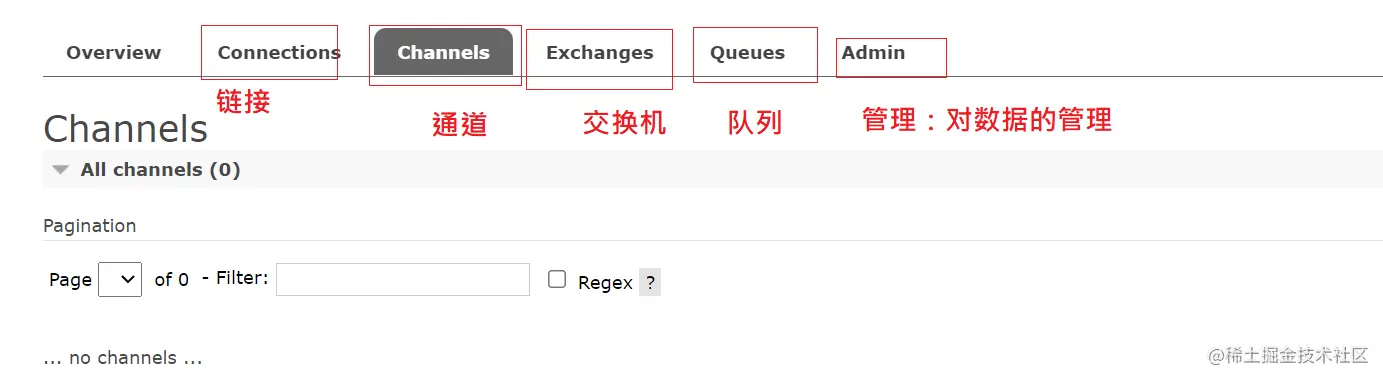 channels:通道,建立连接后,会形成通道,消息的投递获取依赖通道。 -
