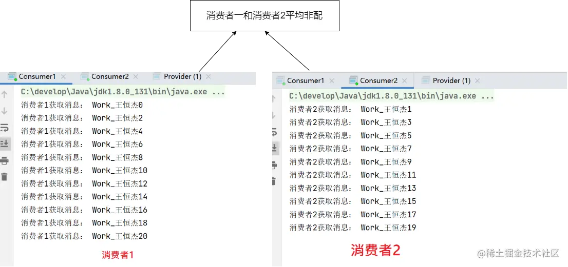 总结:默认情况下,RabbitMQ将按顺序将每个消息发送给下一个使用者。平均而言,每个消费者都会收到相同数量的消息。这种分发消息的方式称为循环。