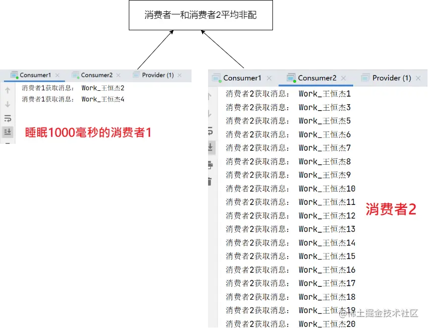 - 案例:让消费者1,睡眠1000毫秒再消费,消费者2不睡眠