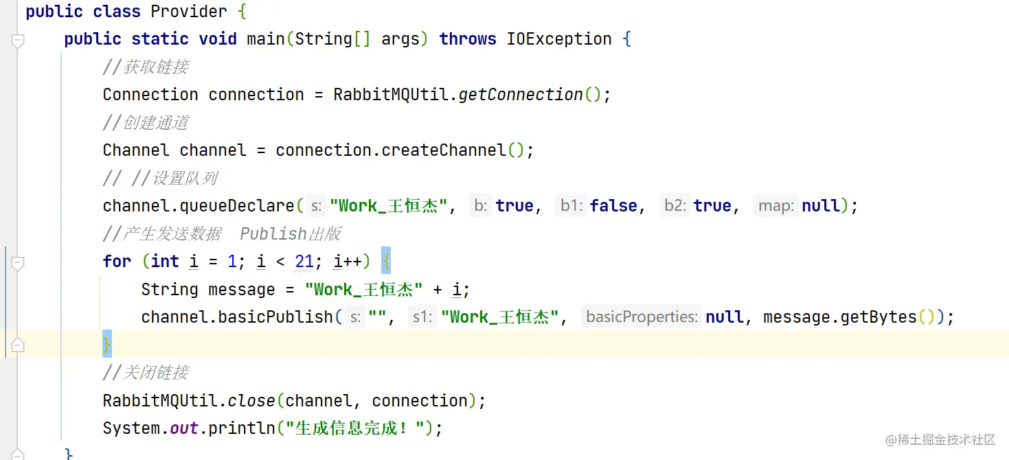 /** * @author 王恒杰 * @date 2022/1/22 19:47 * @Description: */public class Provider { public static void main(String[] args) throws IOException { //获取链接 Connection connection = RabbitMQUtil.getConnection(); //创建通道 Channel channel = connection.createChannel(); // //设置队列 channel.queueDeclare("Work_王恒杰",true,false,true,null); //产生发送数据 Publish出版 /** * @param exchange 消息交换机名称,空字符串将使用直接交换器模式,发送到默认的Exchange=amq.direct。此状态下,RoutingKey默认和Queue名称相同 * @param queueName 队列名称 * @param BasicProperties 设置消息持久化:MessageProperties.PERSISTENT_TEXT_PLAIN是持久化;MessageProperties.TEXT_PLAIN是非持久化。 * @param body 消息对象转换的byte[] */ for (int i = 0; i < 21; i++) { String message="Work_王恒杰"+i; channel.basicPublish("","Work_王恒杰",null,message.getBytes()); } //关闭链接 RabbitMQUtil.close(channel,connection); }}