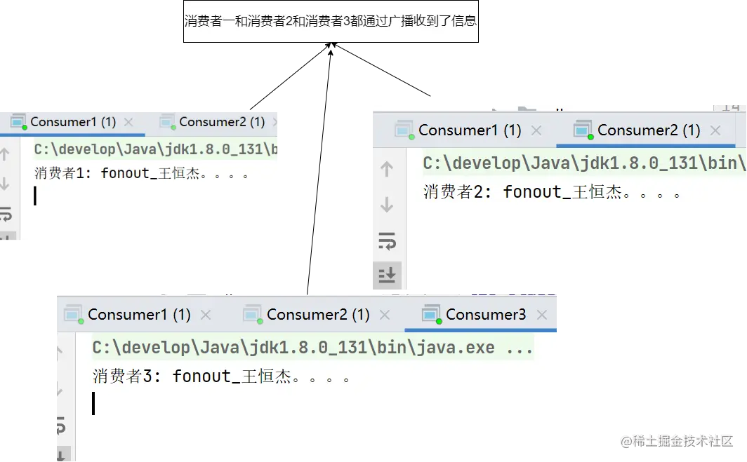 public class Consumer3 { public static void main(String[] args) throws IOException { //获取链接 Connection connection = RabbitMQUtil.getConnection(); //创建通道 final Channel channel = connection.createChannel(); //广播 一条消息多个消费者同时消费 //设置交换机参数 交换机名 交换机类型 持久化 自删 其他 channel.exchangeDeclare("fanout_王恒杰", "fanout", true, true, null); //创建临时队列 String queue = channel.queueDeclare().getQueue(); //将临时队列绑定到exchange 临时队列名 交换机名 路由key channel.queueBind(queue,"fanout_王恒杰",""); //消费消息 临时队列名 是否自动应答 callback channel.basicConsume(queue,true,new DefaultConsumer(channel){ @Override public void handleDelivery(String consumerTag, Envelope envelope, AMQP.BasicProperties properties, byte[] body) throws IOException { System.out.println("消费者3: "+new String(body)); } }); }}