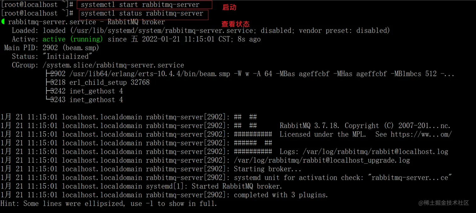 # 8.启动RabbitMQ的服务 systemctl start rabbitmq-server systemctl restart rabbitmq-server systemctl stop rabbitmq-server