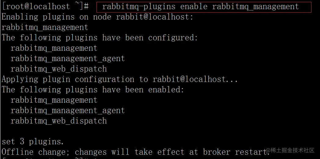 # 7.执行如下命令,启动rabbitmq中的插件管理 rabbitmq-plugins enable rabbitmq_management 出现如下说明: Enabling plugins on node rabbit@localhost: rabbitmq_management The following plugins have been configured: rabbitmq_management rabbitmq_management_agent rabbitmq_web_dispatch Applying plugin configuration to rabbit@localhost... The following plugins have been enabled: rabbitmq_management rabbitmq_management_agent rabbitmq_web_dispatch set 3 plugins. Offline change; changes will take effect at broker restart.