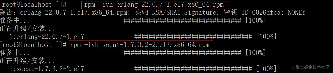 # 2.安装Erlang依赖包 rpm -ivh erlang-22.0.7-1.el7.x86_64.rpm rpm -ivh socat-1.7.3.2-2.el7.x86_64.rpm