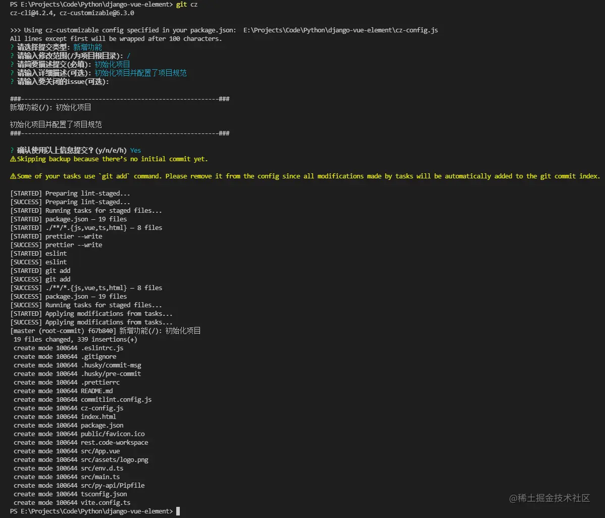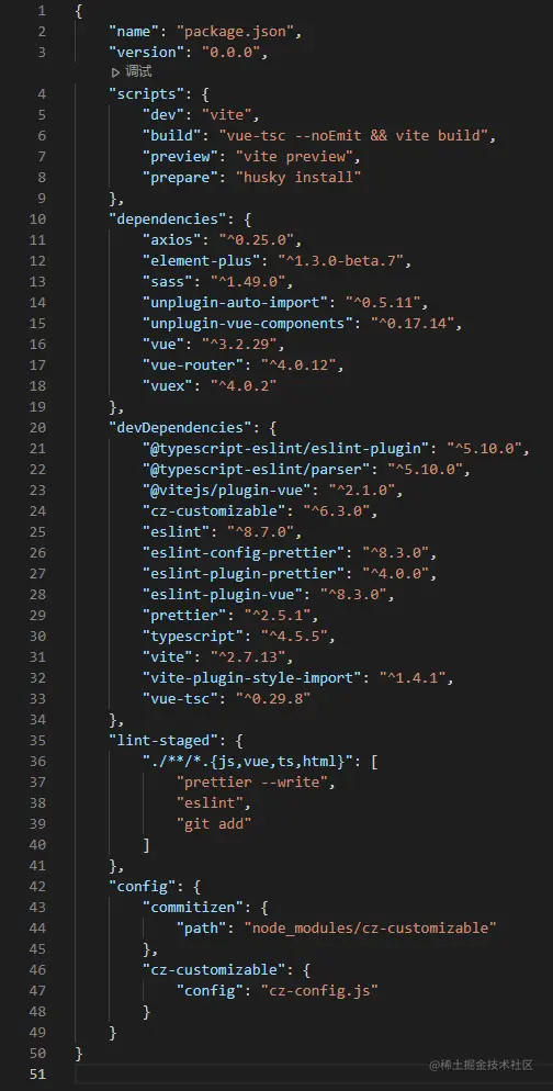 package.json中添加:"lint-staged": { "./**/*.{js,vue,ts,html}": [ "prettier --write", "eslint", "git add" ] }, "config": { "commitizen": { "path": "node_modules/cz-customizable" }, "cz-customizable": { "config": "cz-config.js" } }如下图所示: