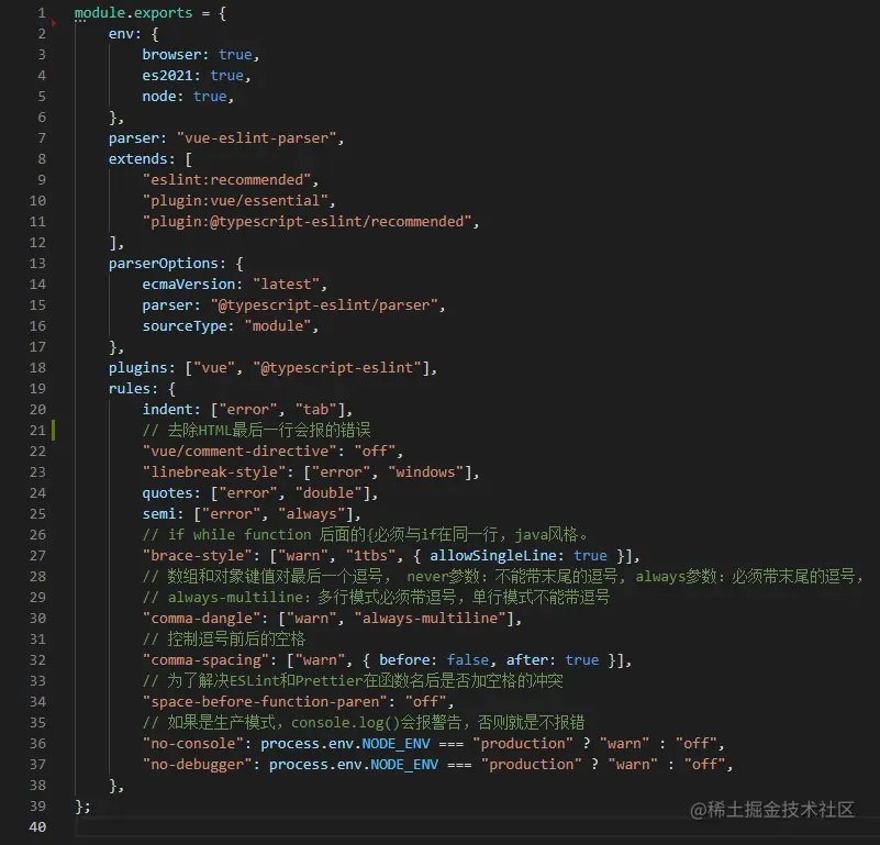 .eslintrc.js配置如下:需要注意:indent那一项,只有两个值,只能选择tab或者空格个数 -
