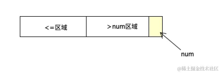 i当前所在的数[i]<num,当前数和小于区域下一个做交换,<区域右扩,i跳下一个