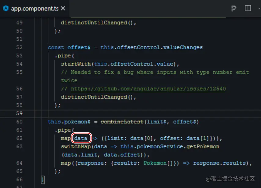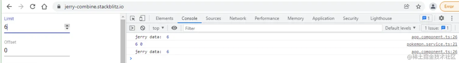 注意这里使用了一个 distinctUntilChanged,也就是说如果 limit$ 的值没有发生变化时,不会向下游 emit 数据。