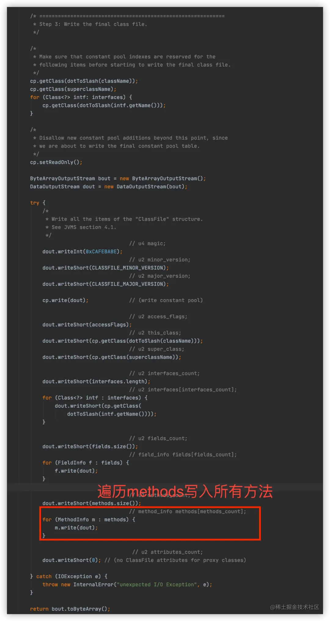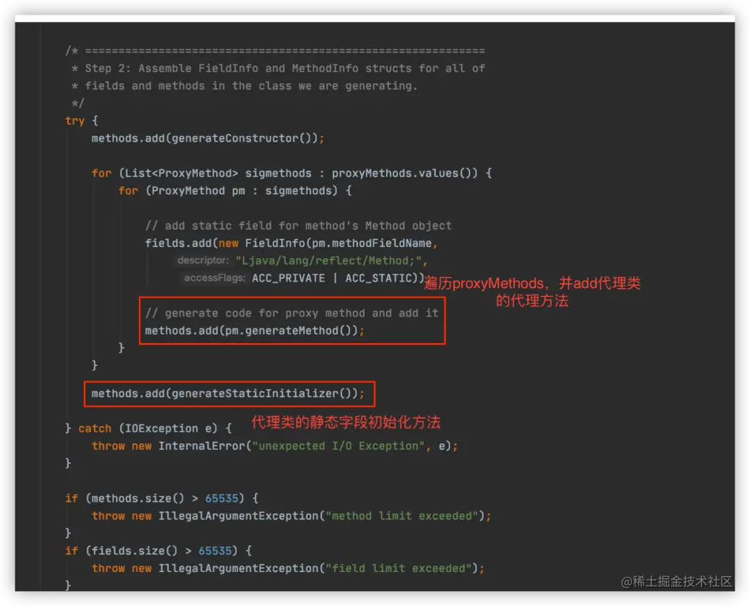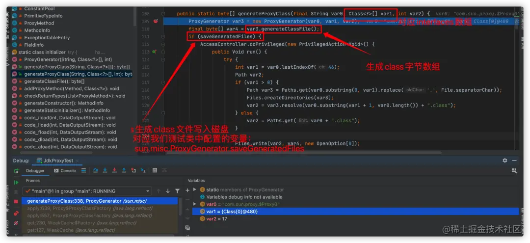 最终生成class是在generateClassFile(),该方法生成类的方法和属性等信息,它会遍历interfaces中的每一个接口class,把class的每一个方法包装为ProxyMethod对象,最后通过ProxyMethod生成代理类的代理方法并输出到字节流中,如下图:
