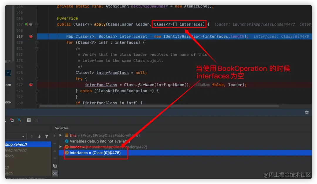 其实,如果目标类没有实现接口,interfaces数组会为空,不会走到这里,我们启动非接口实现类debug如下: