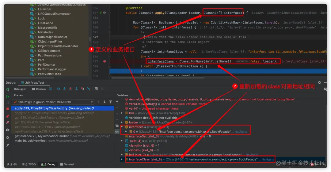 验证入参类加载器按全限定名称重新加载入参接口得到的class对象是否和接口class对象相同,主要也是为了验证类加载器是否相同,因为同一个类加载器加载的class才相同,否则不相同: