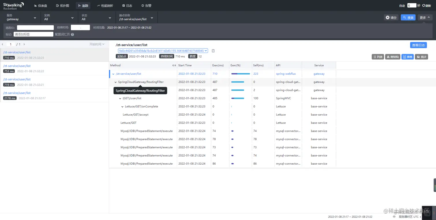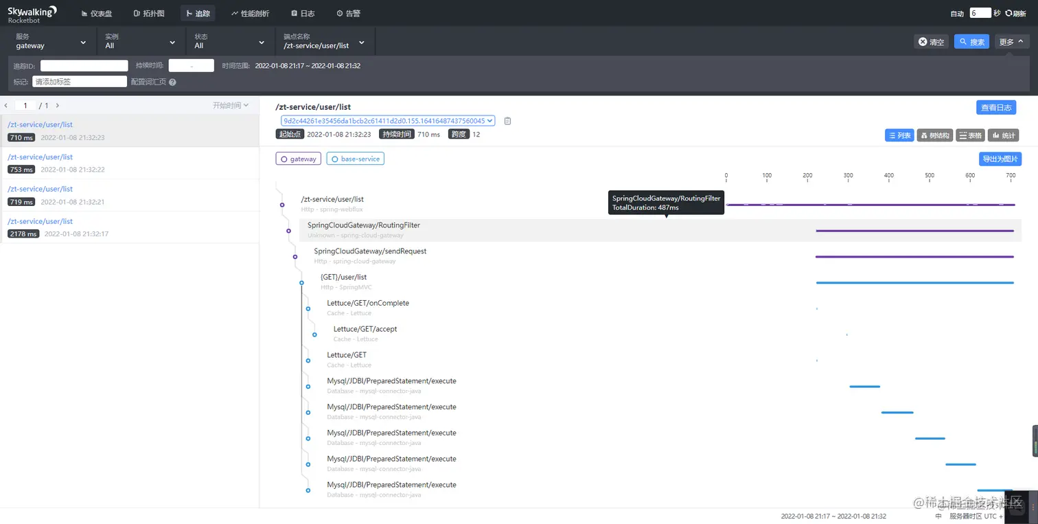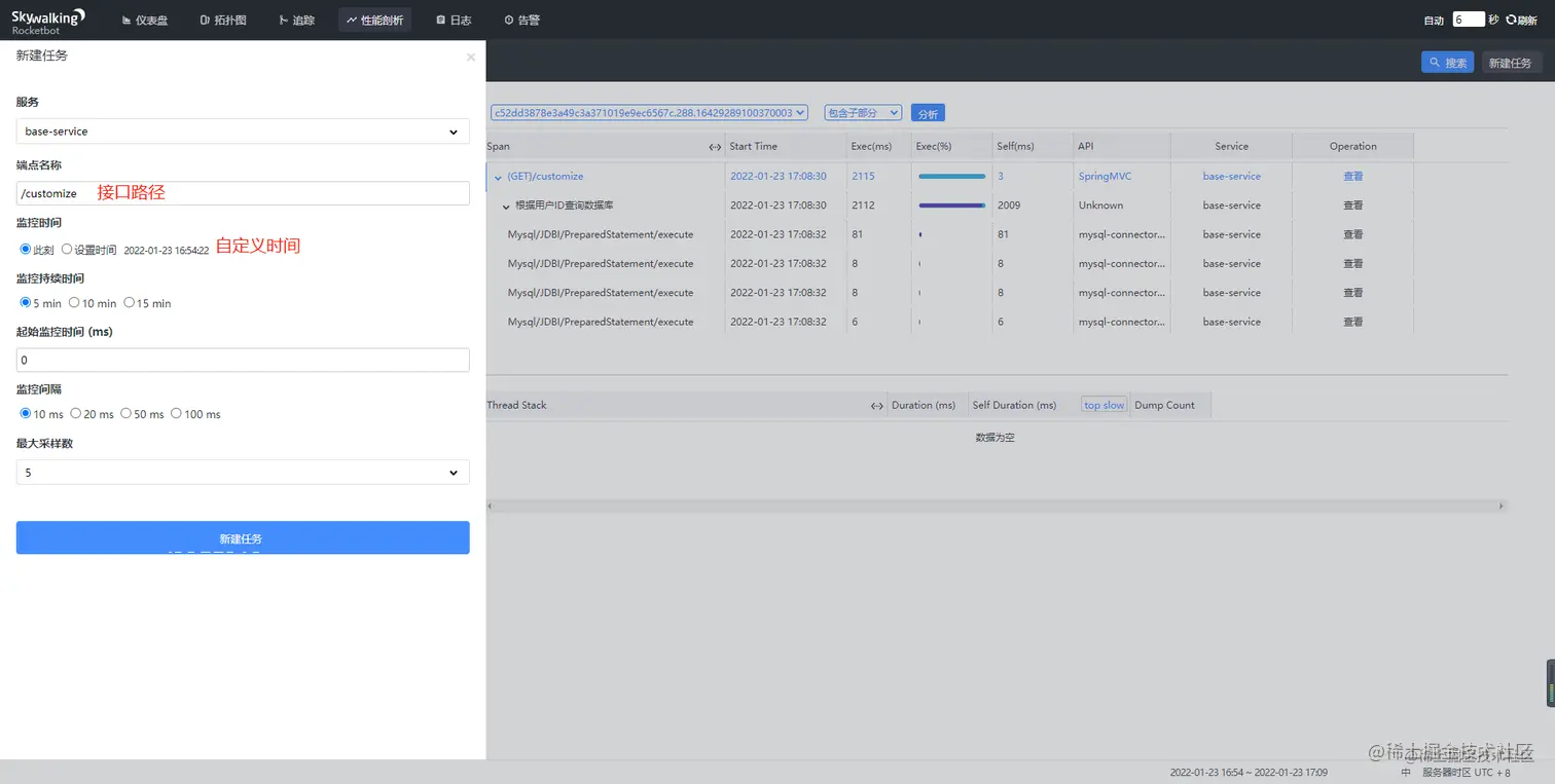 性能监测分析:根据服务、端点、规则建立性能监测任务后会自动记录并生成剖析结果