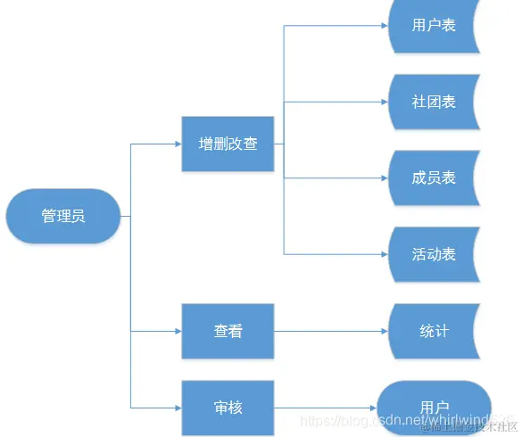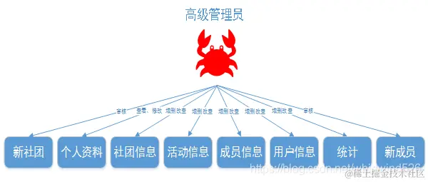 社团干部(会长):能够查看和修改个人信息、可以增删改查所有社团的基本信息、审核普通用户申请加入社团、对社团所有会员信息进行增删改查、对社团所有活动进行增删改查