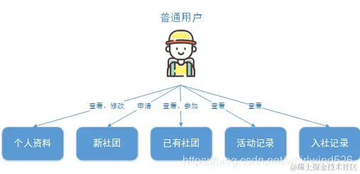 普通用户:能够随时查询和修改个人信息、申请新社团、查看社团信息、加入社团以及查看自己加入了社团的信息