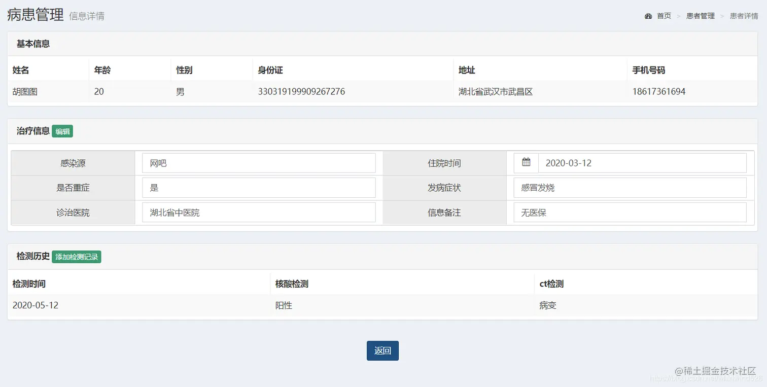 患者详情界面详细的展示了患者的基本信息如下:姓名、年龄、性别、身份证等,治疗信息如下:感染源、是否重症、住院时间、发病症状、诊治医院、信息备注,以及相应的核酸检测及ct检测历史,如下图所示。