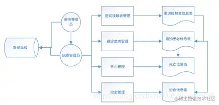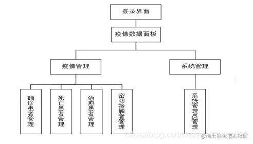疫情信息管理系统应当具备两种对象,疫情管理员对象可以对确诊患者、密切接触者、死亡患者、治愈患者的信息进行管理操作,系统管理员对象在疫情管理员对象的功能基础上可以对系统登录用户进行增删改查。针对需求分析设计了具体模块,系统功能模块图如下图所示。