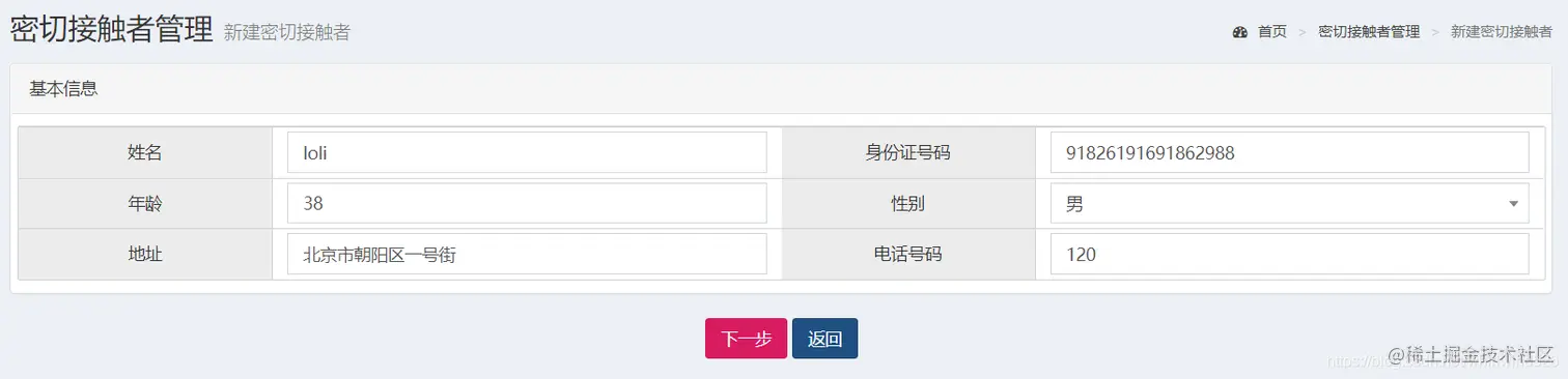新建密切接触者界面包含两部分,一是添加密切接触者的基本信息如下图所示,点击下一步则跳转到添加隔离信息界面如下图所示