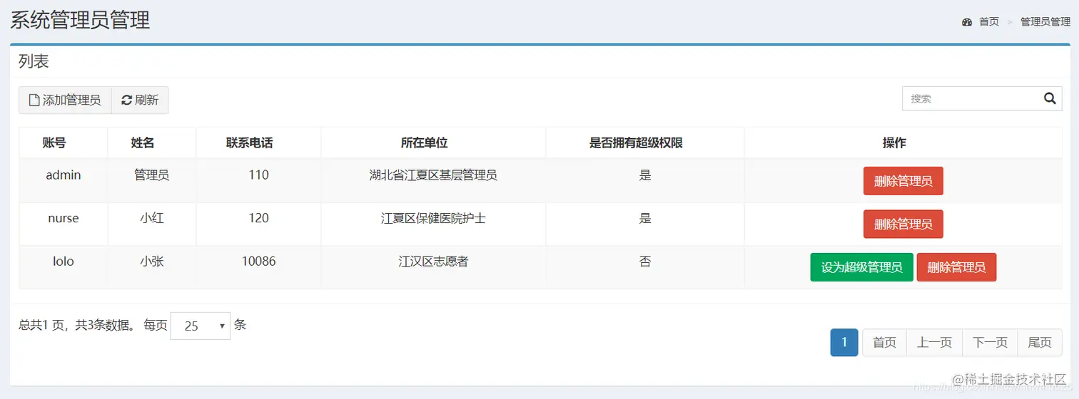 系统管理员界面可查看管理员信息、添加管理员、对管理员进行删除、将普通管理员设置为系统管理员操作,如下图所示。