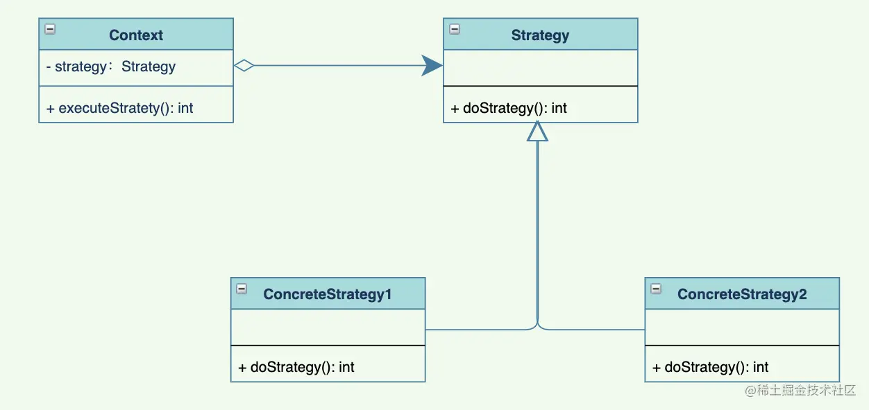 ConcreteStrategy):以Strategy接口实现某些具体的算法,具体的策略可能多个,也可以相互替换 - 上下文(