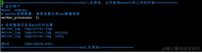 从配置⽂件开始到events块之间的内容,此处的配置影响nginx服务器整体的运⾏,⽐如worker进程的数量、错误⽇志的位置等