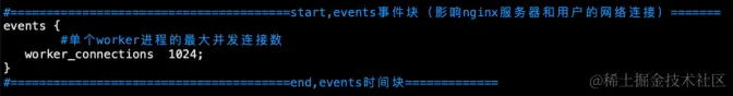 events块主要影响nginx服务器与⽤户的⽹络连接,⽐如worker_connections 1024,表示每个workderprocess⽀持的最⼤连接数为1024