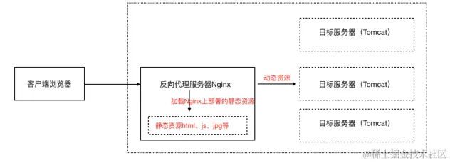 反向代理服务器位于用户与目标服务器之间,但是对于用户而言,反向代理服务器就相当于目标服务器,即用户直接访问反向代理服务器就可以获得目标服务器的资源。同时,用户不需要知道目标服务器的地址,也无须在用户端作任何设定。反向代理服务器通常可用来作为Web加速,即使用反向代理作为Web服务器的前置机来降低网络和服务器的负载,提高访问效率。