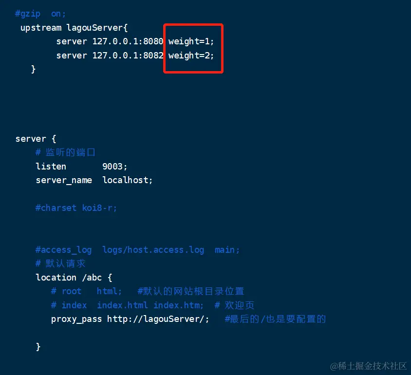 weight代表权重,默认每一个负载的服务器都为1,权重越高分配的请求就越多