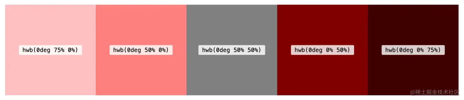 与 HSL 一样,色调可以是 0 到 360 内的任何值。黑度和白度用来控制有多少黑色和白色混合在已选色调中,它们也是0-100%之间的值,当为100%时,就会出现全黑或者全白。如果等量的白色或者黑色混合在一起,颜色就会变得越来越灰。这个函数对于创建单色调色板非常有用:
