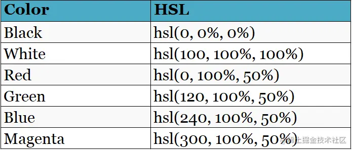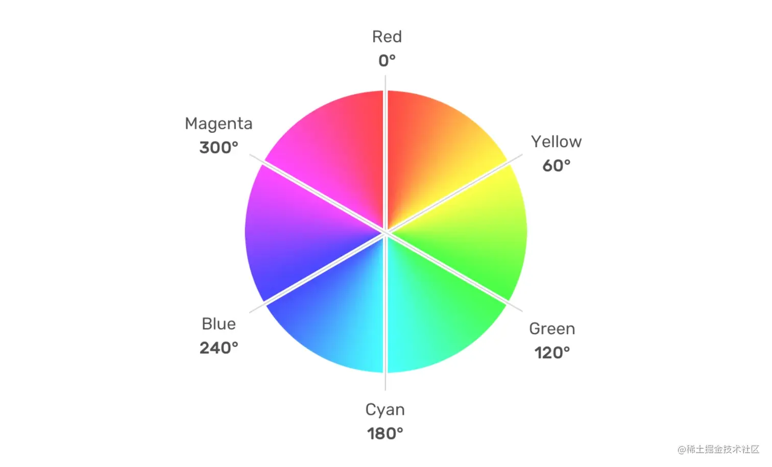 HSL 全称是 Hue-Saturation-Lightness,分别表示色调、饱和度和亮度。它基于 RGB 色轮的。每种颜色都有一个角度以及饱和度和亮度值的百分比值。下面就先来了解一下这三个概念,