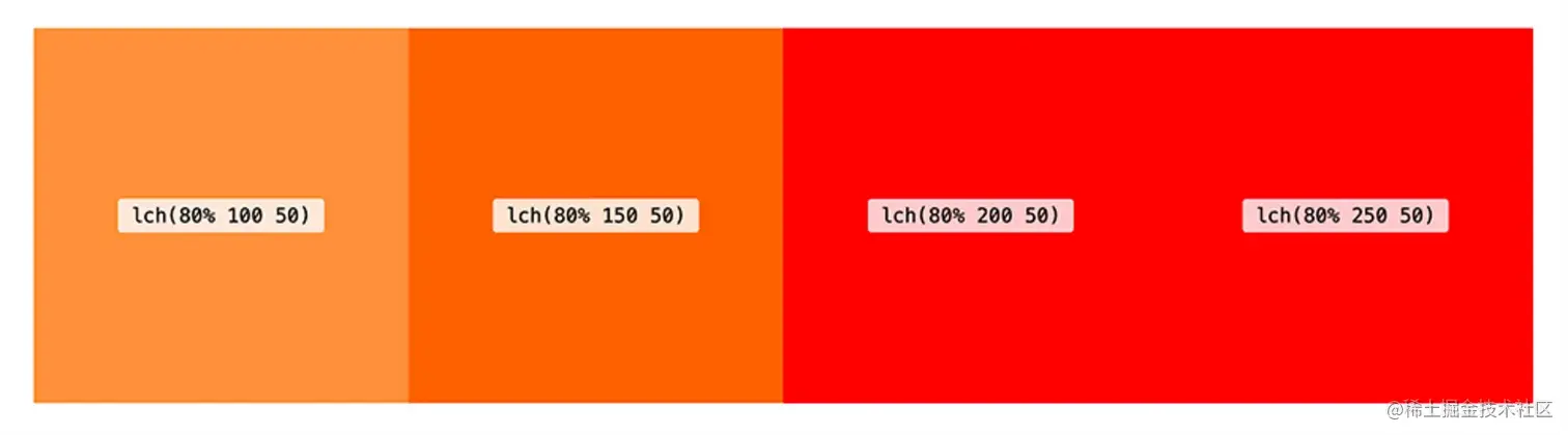 LCH 代表亮度、色度和色调。它与 Lab 具有相同的 L 值,但不是使用坐标 a* 和 b*,而是使用 C(色度)和 H(色调)。色调可以是 0 到 360 之间的值。色度代表颜色的量,它类似于 HSL 中的饱和度。但是色度值可以超过 100,理论上它是无上限的。