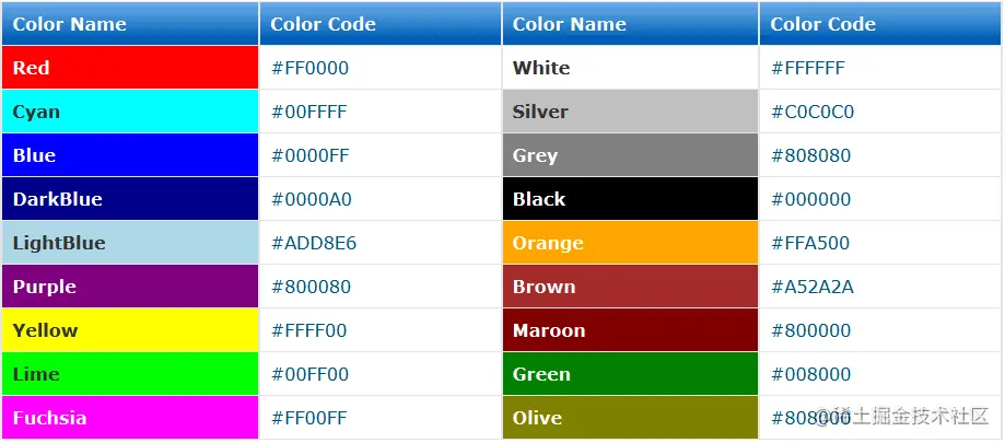 CSS中提供了148个命名颜色,所有浏览器都支持这些名称,这些名称都是被预定义过色值的。下面是部分颜色名称以及对应的十六进制颜色值: