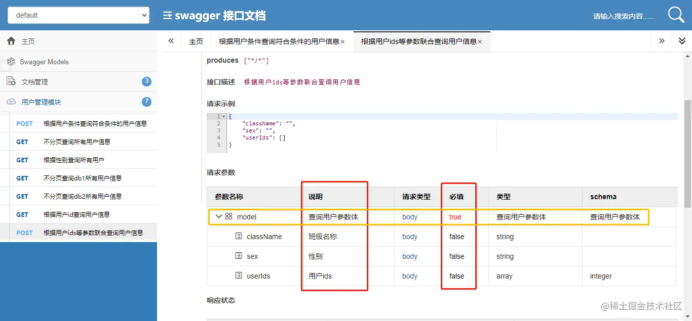 至于上方截图涉及到的是否必填一栏,也是来源于@ApiModelProperty 这个 注解,自带是否必填这个属性(required),属性默认是false不必填,如果你要告诉前端及测试接口人员指定这个参数必须要填写,那你就把required属性设置值为true 即可,即表示该参数必填,如果不填,则肯定是不会通过接口调用的。