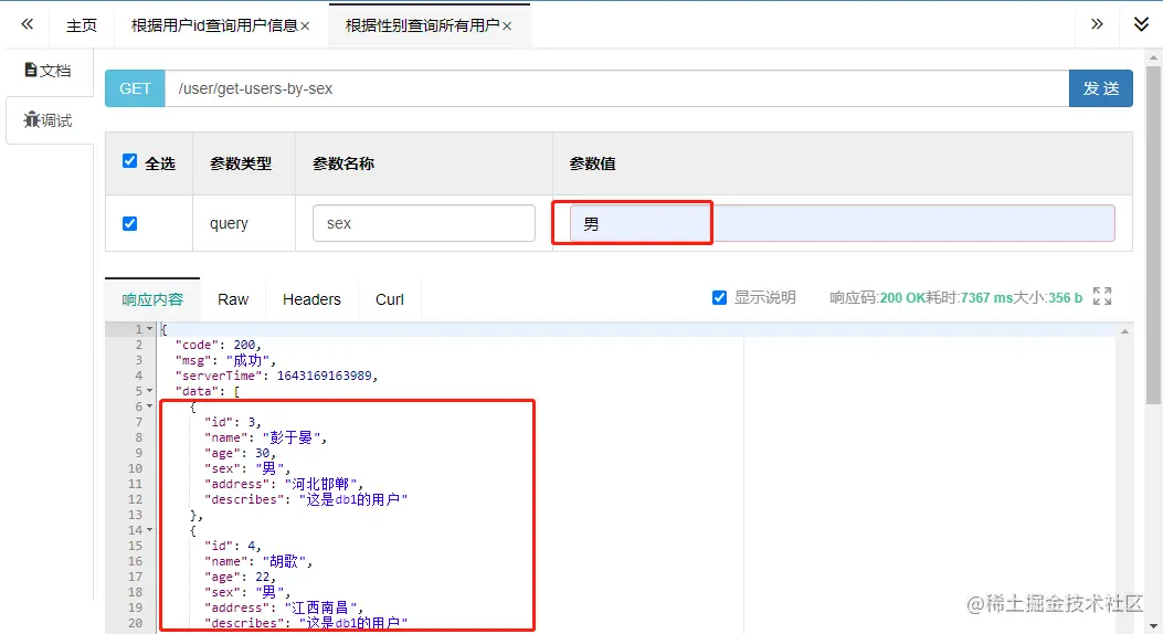 接着我们将性别字段,随便填入一个值,再进行调用,这个时候我们再看。