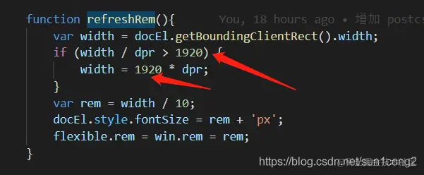 2 找到node_modules中lib-flexible 的flexible.js文件,修改flexible.js中的 refreshRem方法如下: 修改原始尺寸,图中是按照1920比例进行自适应