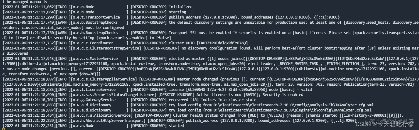 监听或打开安装目录下的logs/elasticsearch.log,有如下的日志输出即为成功
